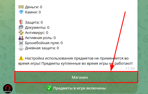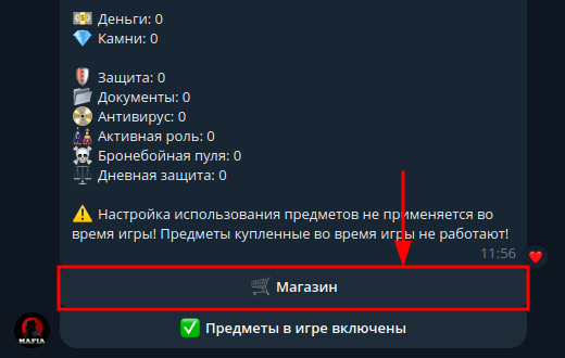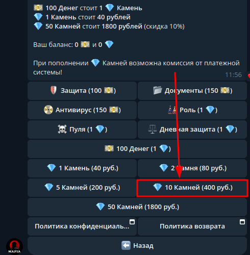 4.4. После приобретения камней можно покупать игровые вещи (команда /profile) в боте, полный перечень услуг доступен на странице Документы в разделе "Услуги и цены"